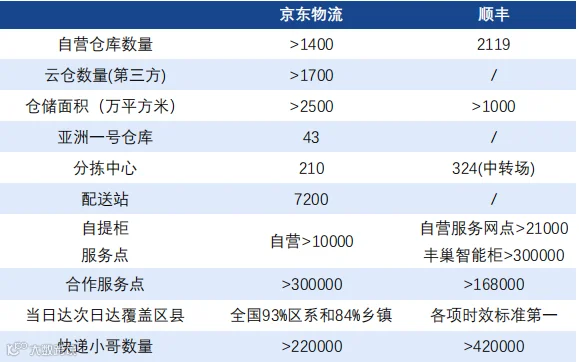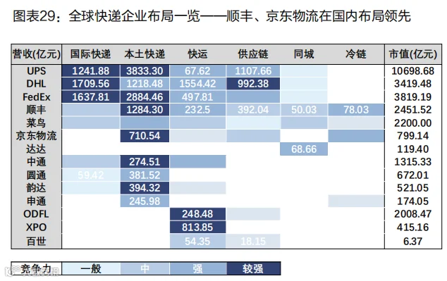 发展至今,顺丰已在多元业务布局上全面领先,六大新业务板块基本完成流量的扩张;京东物流布局正行至中途,先后收购跨越速运、德邦股份补足重货网络短板。
