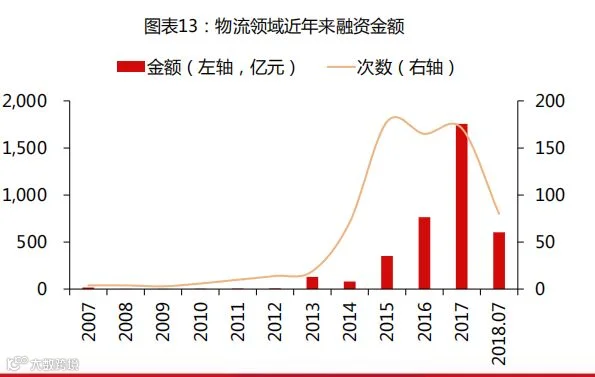 过去10年,物流领域融资金额共有两次大幅跨越。第一次是2012年-2013年,融资金额从8亿跃升至130.8亿,同比增长15.35倍,单笔融资金额同比增长21.18倍。第二次是2016年-2017年,融资金额同比增长1.30倍,单笔融资金额增长1.22倍。这两次高峰分别对应着快递和快运行业增速大幅提升年份。