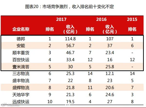 2017年,头部快运公司业绩增速较快,收入增速均普遍超过50%,由此推断全行业增速约可达到40%以上。虽增速快,但行业仍处于激烈竞争中,行业格局的稳定。2017年收入排名前亓除德邦外,其余均是后起之秀。
