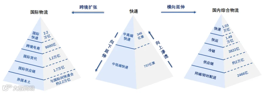 快递扩张的三个层次,快递产业链纵向延伸——物流产业链横向延伸——从中国到全球的跨境扩张