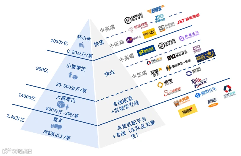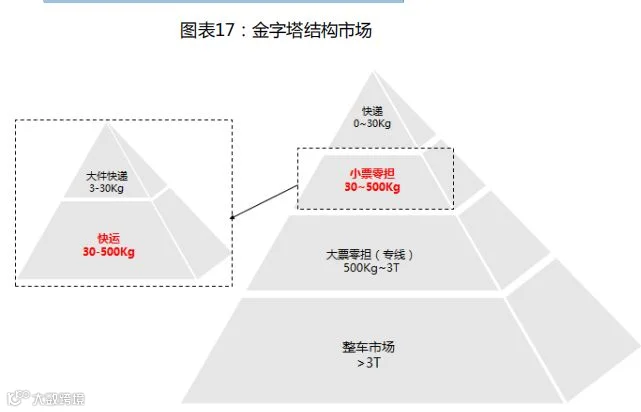 金字塔结极:如果按照重量、市场规模由大到小依次排序为:整车、大票货、小票货、快运(包括大件快递)。靠近金字塔尖的市场,产品越容易实现标准化,利润率也越高。