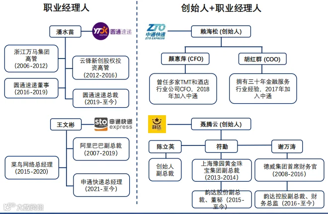 周韶宁和王卫前瞻性徆强,同时百世和顺丰的戓略布局最为完善。赖梅松、聂腾云、崔维星稳扎稳打,中通、韵达和德邦主业都徆突出。