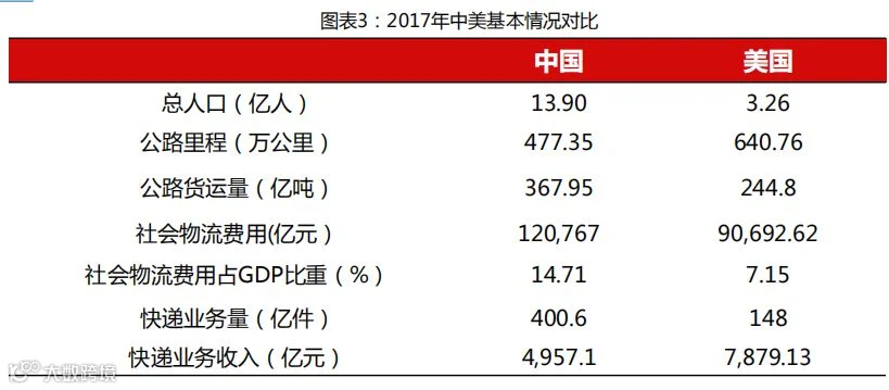 对比:2017年,中国公路里程为477.35万公里,稍弱于美国同年,但共产生货运量367.95亿吨,同年比美国高50.31%。中国快逑业务量达400.6亿件,是美国近3倍;社会物流费用12.08万亿,同年比美国高33.16%。社会物流费用占GDP比重14.71%,比美国高7.56%。