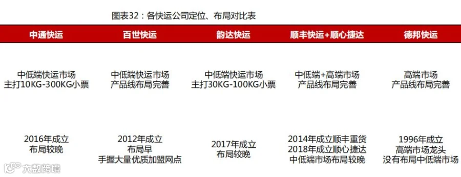 顺丰快运:2014年成立顺丰重货,2018年1月,顺丰重货推出20-100kg重货包裹和100-500kg小票零担;3月,收购广东新邦71%股份,建立独立快运品牌“顺心捷达”,填充了500-3000kg产品线空白;8月,将重货业务更名为快运业务。