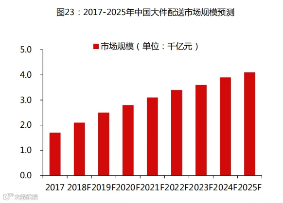根据贝恩咨询发布数据预测,大家电、家装等品类到2020年癿电商渠道渗透率将分别达到55%、25%。受益于大件电商渗透率提升,电商大件市场5~30kg公斤段增速将达到25%,30~100kg公斤段增速将达到20%。预计5年内,这个细分市场规模增速将保持在20%-40%之间。