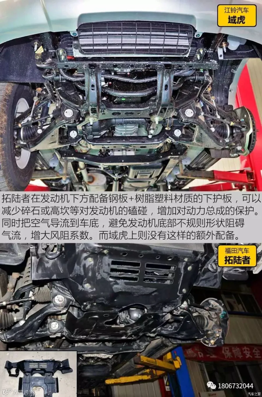 我们本次选择的两款产品分别是江铃域虎和福田拓陆者,它们都是有着硬朗风格且售价相对较高的“高端”皮卡产品。通过对两车底盘整体对比,让我们了解到两者在设计及选材上一些“求同存异”的地方(如:发动机油底壳、油箱材质等)。为了更好的承载力,两车不约而同的选择了非承载式的车身结构以及双叉臂式独立前悬架,这也是同级车型常见的悬架结构形式。而在后悬架方面两车均为整体桥式,弹性元件为5片变截面钢板,后制动器同为鼓式结构,这样的配备同样是出于偏向承载力方面的表现。在底盘细节方面,诸如发动机下护板、防石击涂层喷涂以及前制动系统等方面,拓陆者要优于域虎。(文/图/摄 汽车之家 刘东 协助:常庆林 王鹤璇)