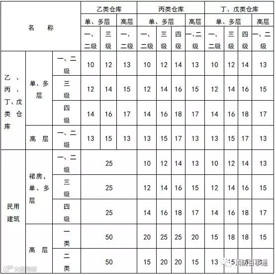 乙、丙、丁、戊类仓库的之间及与民用建筑的防火间距不应小于下表的规定。