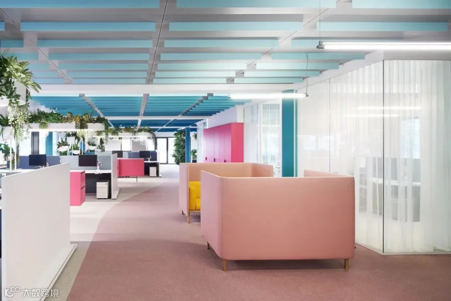 在这个项目中对身份缔造者来说,尤其吸引人的是在不改动当前房体结构的前提下,彻头彻尾地改造一个物业。通过包覆天花板,营造出完全不同的气氛。我们保留了嵌板,但加以彩条作装饰补充。去掉灰色的金属天花板后,将颜色作渐变处理,创建出新的空间深度,但同时又明显利于寻找精神上的平衡点。因为蓝色在促进创造力的同时,能够让心神宁静下来。向白色的过渡为空间增添了额外的开放度和轻盈度。我们有意不对办公室中的通道作过度修饰,以免人在工作时分散注意力。粉红色的走道能彻底让情绪放松下来,另外还可以增进员工之间相互倾听与鼓励。
