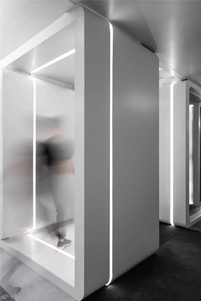 粒子对撞机,看起来像是一个不同尺寸的机械设备,不仅在隐藏原始建筑物的承重柱子方面起着重要作用,而且还是一种具有隔声功能的「电话亭」设备。