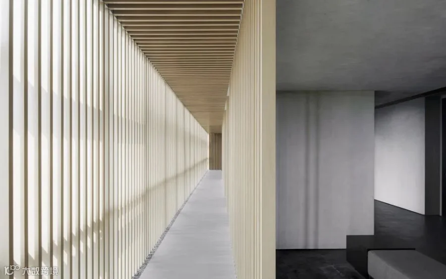 薄暮时分,阳光倾洒,在地面刻出一道道阴翳,源自自然的时光变幻给穿越悠长廊道以「仪式性」的行为体验。