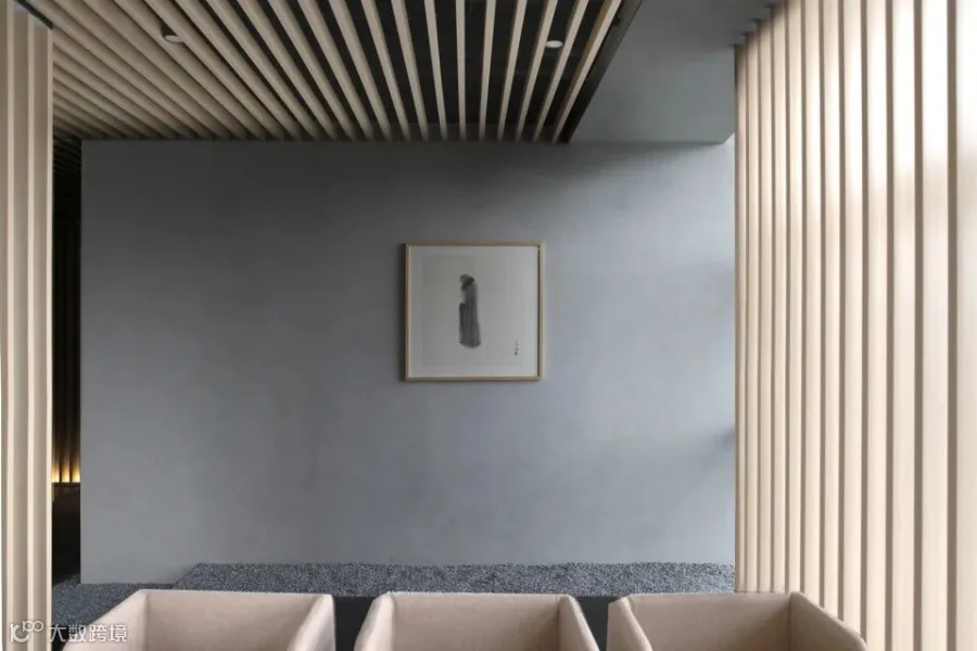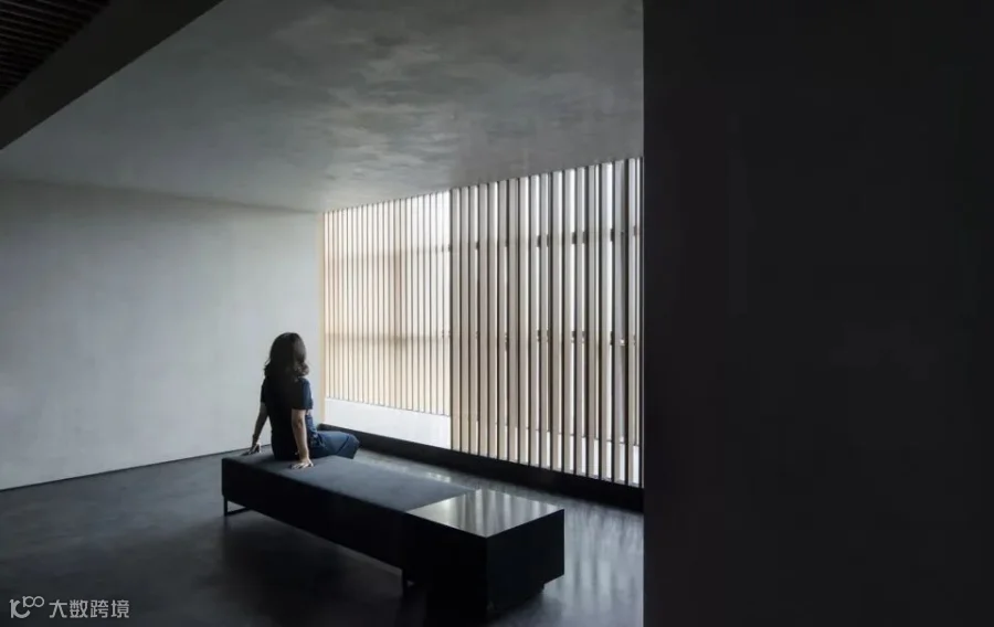 空间北侧是俯瞰城市风景,狭长且具有「透视感」的格栅廊道,从馀白展厅到信步闲庭的室内唯一通道。我们以「极致夸张」的手法延长这一走廊,沿着玻璃幕墙的整面格栅将城市景观虚化,缓和冰冷的玻璃钢结构大楼立面,将自然光线剪入室内。