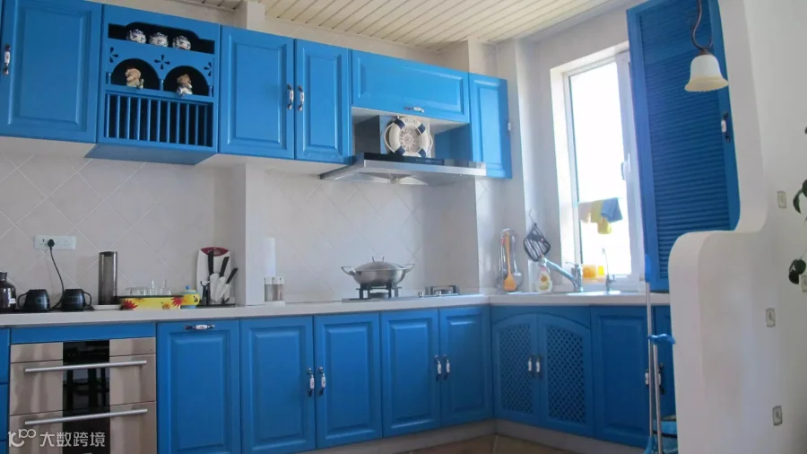 厨房选用的蓝色的橱柜,墙上的白色瓷砖调调十足,地中海风格热情的味道不断的溢出。