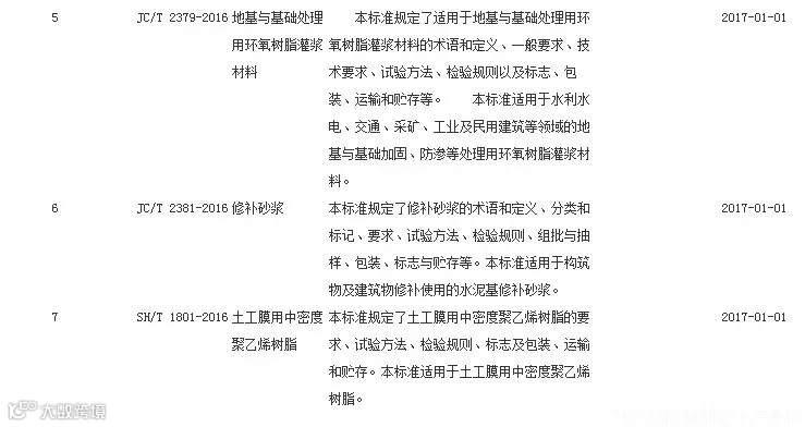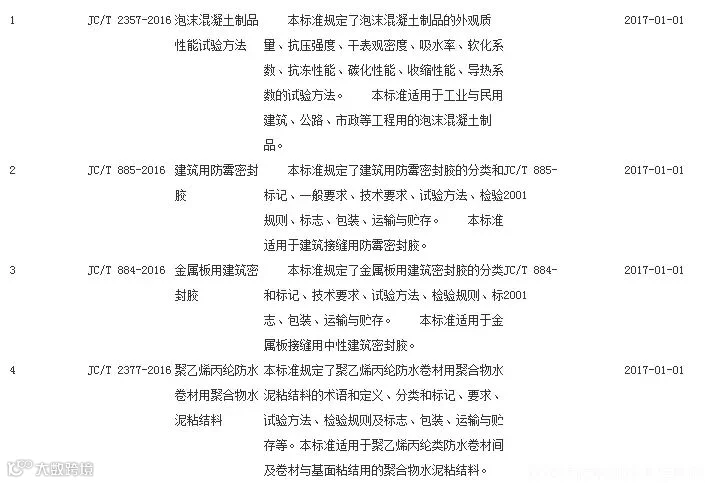 近日,工信部发布2016年第37号公告,批准了425项行业标准。《聚乙烯丙纶防水卷材用聚合物水泥粘结料》、《建筑用防霉密封胶》等多项跟建筑防水与密封、保温等相关的标准在列,实施日期均为2017年1月1日。详情见下表: