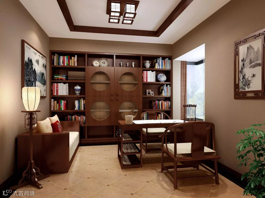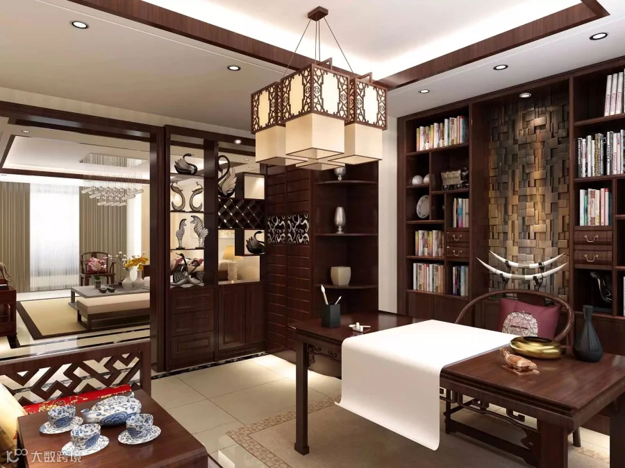 我们都知道书房是居家者的私人场所,一般不会接待客人,因此我可以摆放一张沙发和一个茶几,然后用一个镂空隔断很好的分隔开,供我们品茶休息。