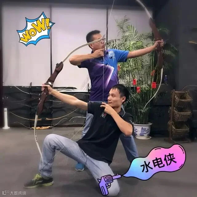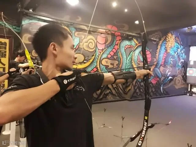 阿涛老师给我们示范的是地中海式射箭,技术特点就是用一手开弓,另外一只手的食指中指无名指三指来拉弓弦,并且把箭尾夹在食指和中指之间,用力开弓到脸颊,然后自然撒放。