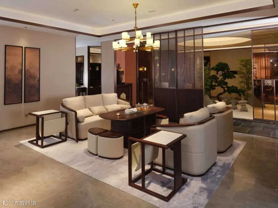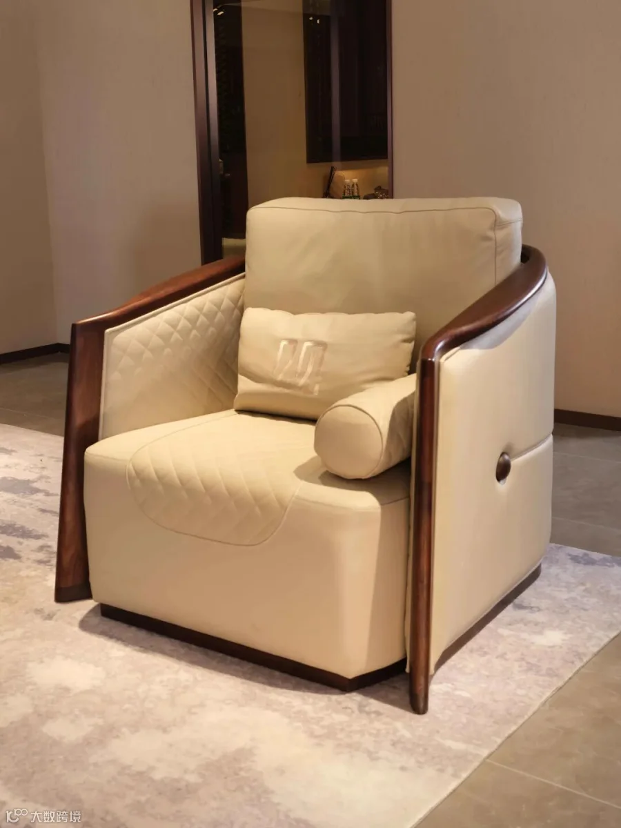 观然沙发采用大面积3D羽丝绒软包填充提升舒适度,真皮刺绣工艺和水性开放漆工艺的使用同时兼顾了产品的美观性和环保性。开放式“簸箕”造型还有迎宾聚财的美好寓意。