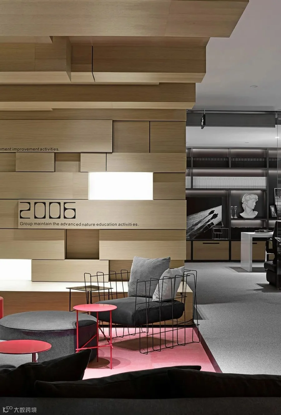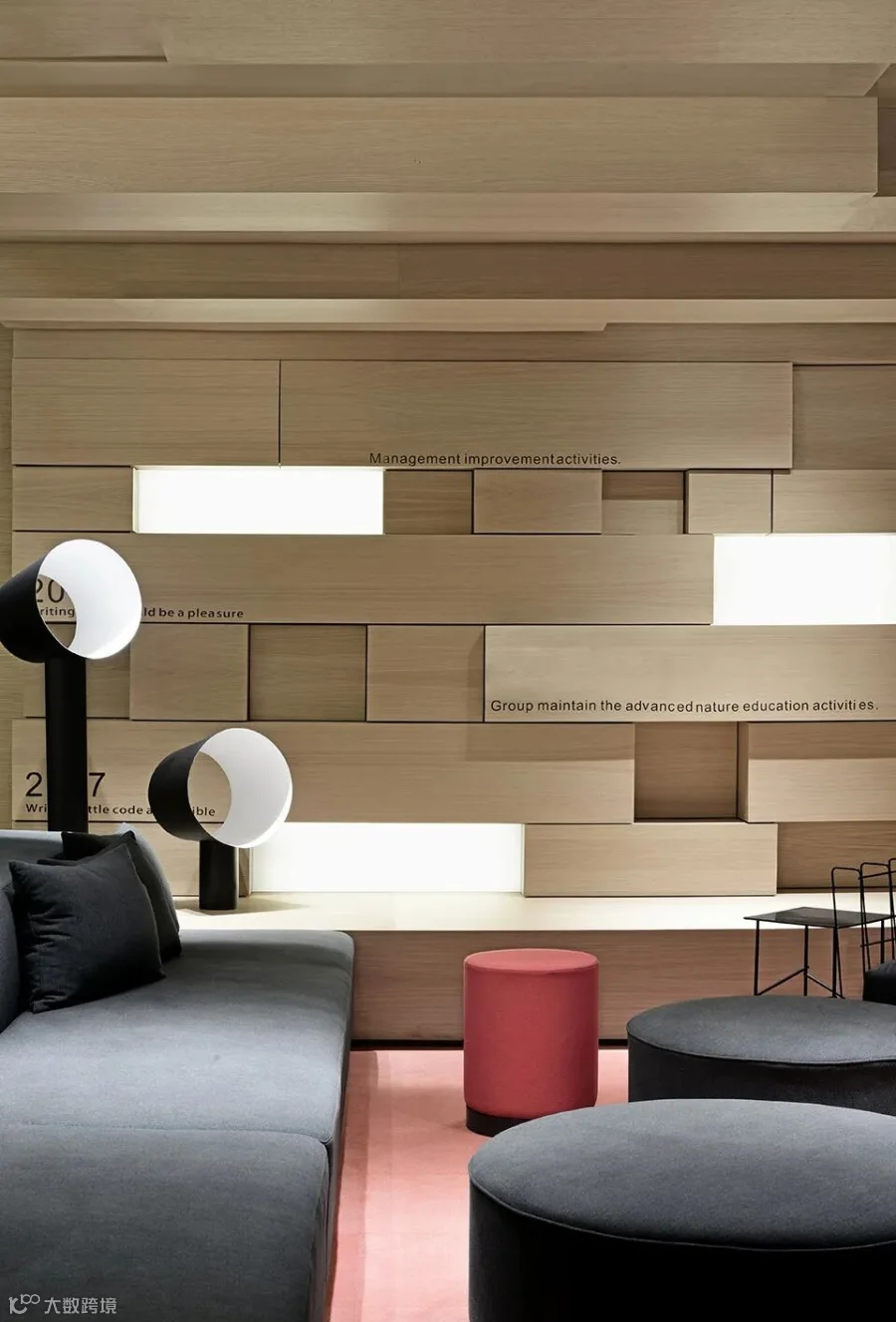 交错排列的木块在水平方向上保持平衡和稳定,将传统的办公室入口转变为多功能空间枢纽。作为空间之间的连接,它们充当集成设计中空间元素之间的媒介和摩擦。由于空间之间的摩擦,会产生空间「渗透感」。
