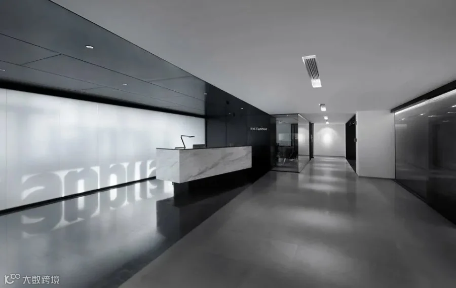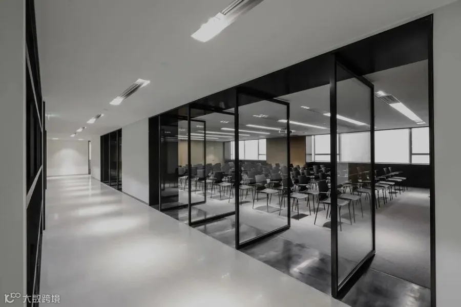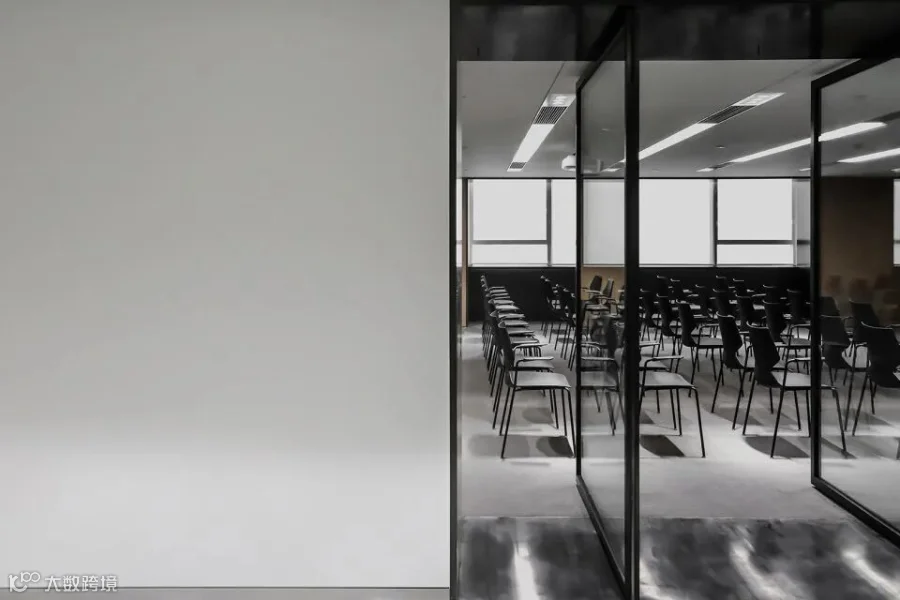 整面的磨砂玻璃背景墙柔化了室外光线,通透轻盈。内置的公司标识随时间推移与光线变化,形成独特的视觉体验。等候区的内立面采用可移动的金属饰面板,调节光线的节奏,形成「明暗交替」的韵律感。