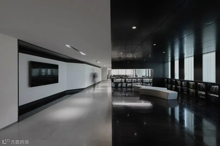 不满足原空间网格为基础的透视表达,因此调整了入口前区的网格角度,增强了透视的「纵深感」,形成一种戏剧性的空间效果。顶面、墙面以及地面在黑色不锈钢、黑色金檀木纹石等材料的限定下,营造出一个倾斜放置并具有反射效果的「黑」盒子,表现出与周边白色空间的强烈对比。