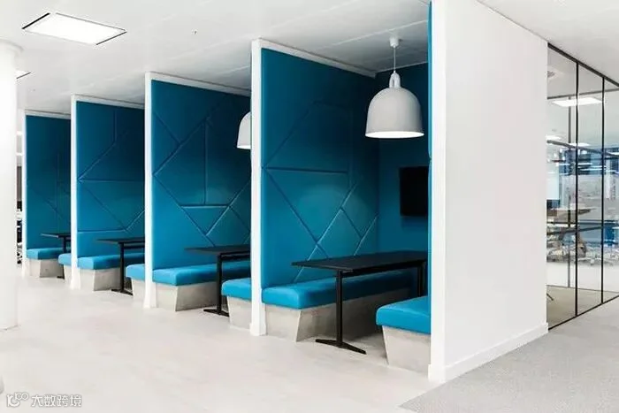 除了用于接待访客同时也是大型集会、交流协作和派对活动之地外,设计团队还使用蓝色点缀与会议空间和灵动的工作区。让工作者处于宁静的空间内工作,冷色调让他们保持冷静、清醒的思维