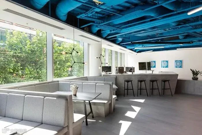 蓝色是Carwow的公司标志色,于是便大片使用蓝色,将接待区相连的休闲区以蓝色顶面设计,裸露的顶面和设备管道都统一在纯净的蓝色之中,也是本案例最令人赞叹的创意构思之处。