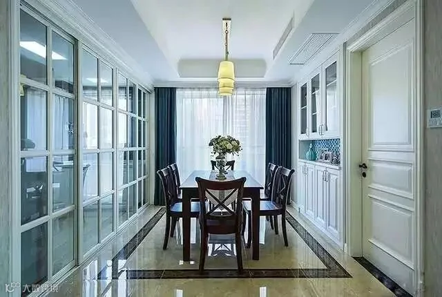 餐厅,厨房的门采用一排的玻璃拖拉门,整个餐厅显得更加的敞亮,光线非常的好。