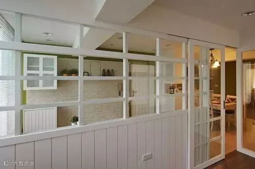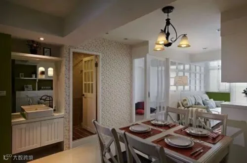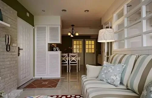 由于空间本身不大,因而舍弃规划独立玄关影响空间感;设计团队使用地板的复古砖,形成明确的玄关意象,也把乡村风情悄悄带入。