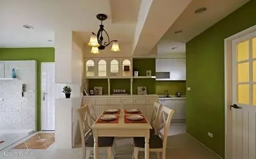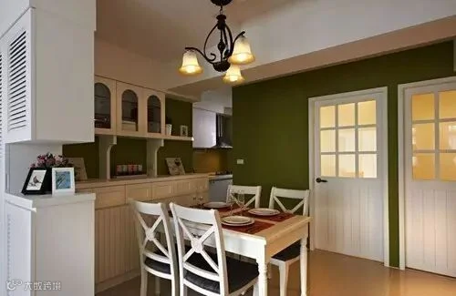 标准的乡村感餐厅,以墨绿色和白色基本元素,铺叙温暖简朴的用餐氛围。
