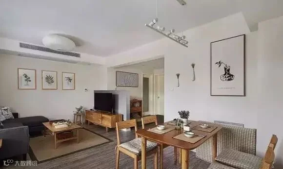 原木家具和灰色布艺沙发,营造沉稳宁静的氛围。简约的客厅没有过多的装饰,却不显简单,墙上三幅木质框挂画点缀墙面,别有风味。