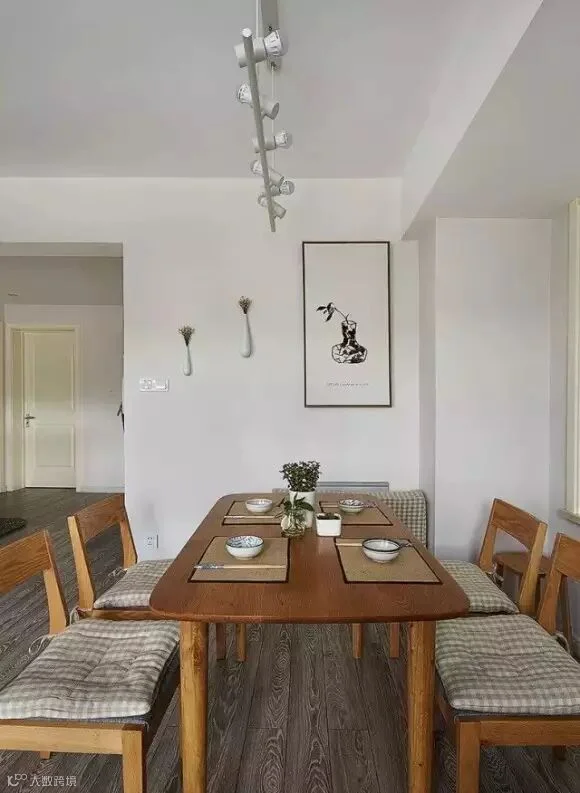 餐厅的桌椅也是木质的,原木的温润营造轻松的进餐氛围。墙上装饰花瓶插上几枝干花,和旁边的装饰画上的图案相映成趣。