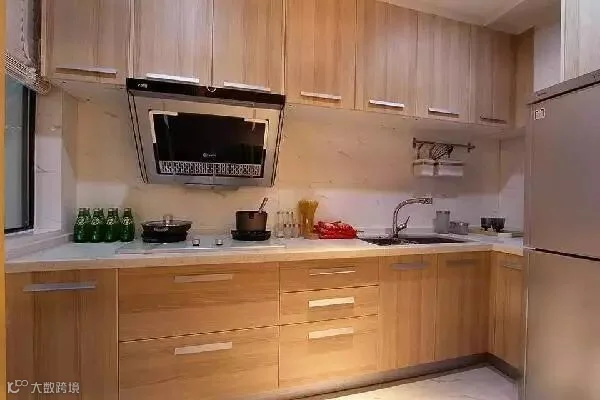 橱柜用木色柜门搭配浅色的石英石台面,延续了客厅该区域的风格元素