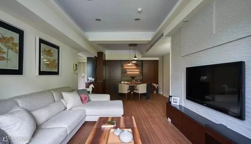 设计师以具有调节室内湿度的硅藻土作为电视主墙的材质,搭配鱼鳞状拉纹,展现立面的律动及层次感。