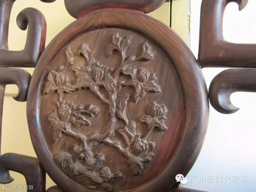 广式家具的部分装饰图案甚至直接取材于外国纹样,比如这个民初的椅子橹上的“东洋花”图案,明显区别于传统的牡丹花纹。它也被广东人叫做“摩登花”,其实就是向日葵,有蒸蒸日上的寓意。椅背也不似清朝那样笔直,而是带点弧度;椅面是“堕面”,有点倾斜,所以坐起来更舒适。它的扶手是“灵芝手”,背靠是“海棠面”,体现中西合璧的味道。