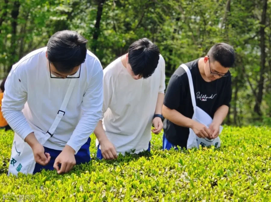 采茶青年穿梭在茶树田园间