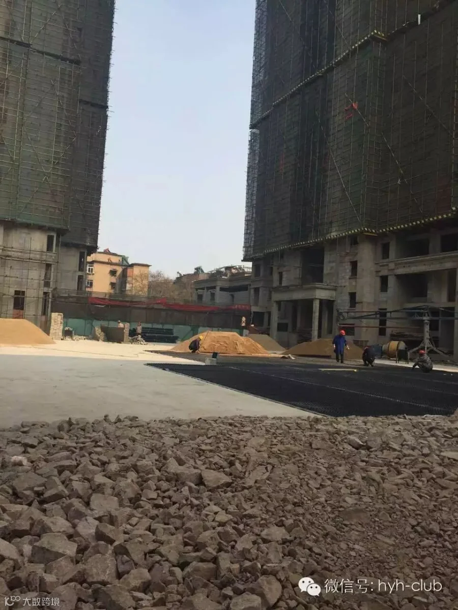 1#~3#楼园林展示区景墙与排水板施工中。
