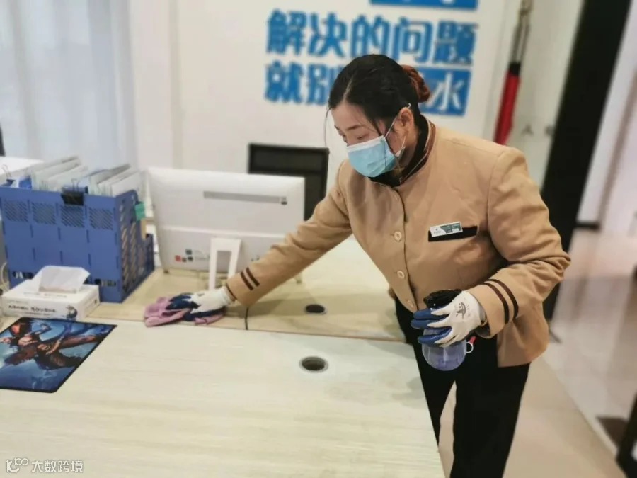 为保证您拥有一个卫生、安全的环境,员工上班期间将佩戴可以防飞沫的医用口罩。(如果在服务沟通过程中出现不太能听清的情况,希望客户朋友们能够多一点点耐心,感谢大家!)同时,每天使用消毒水对各项目案场的每一个角落进行规范彻底的消毒。