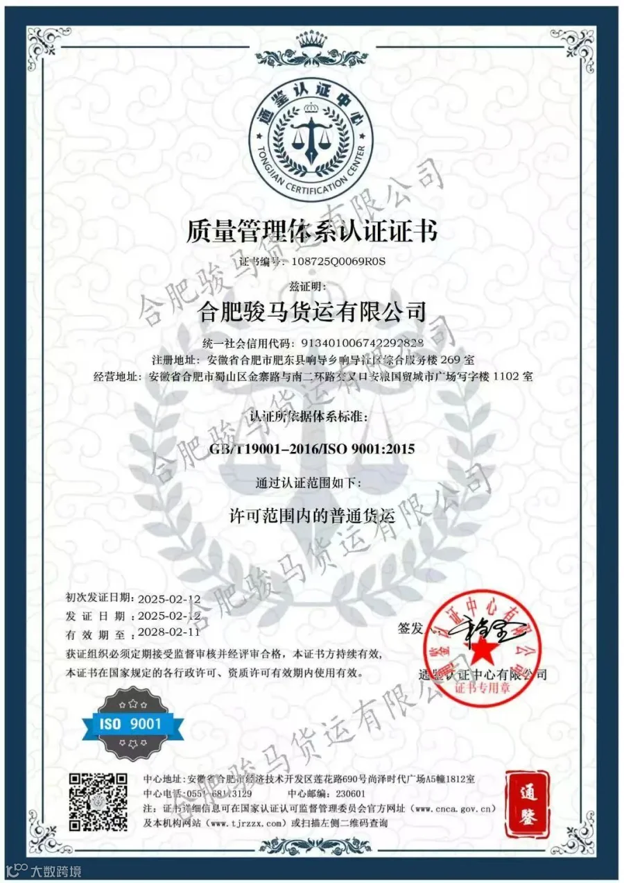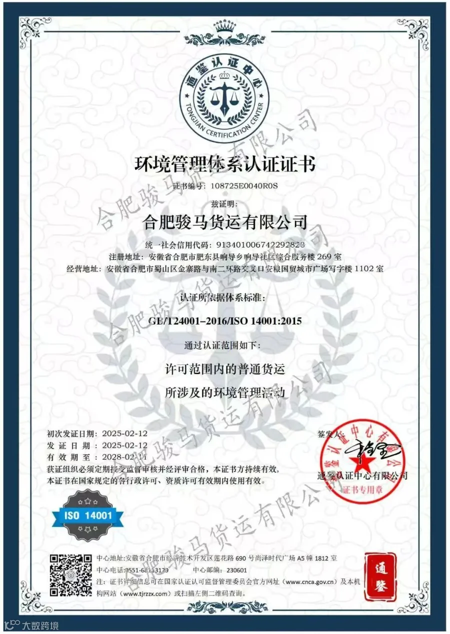 在物流行业竞争日益激烈的当下,历经严格审核,合肥骏马货运有限公司成功获得ISO 9001质量管理体系、ISO 14001环境管理体系、ISO 45001职业健康安全管理体系认证!