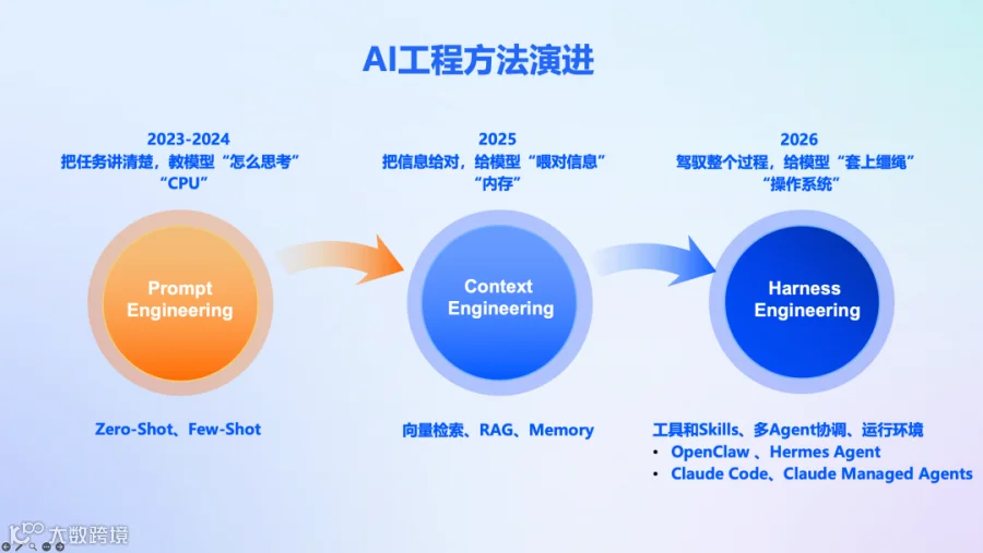 2026(Harness Engineering):重点在于工具链、Skills、多 Agent 协调、运行环境等,给模型“套上缰绳”,驾驭模型正确处理复杂任务。