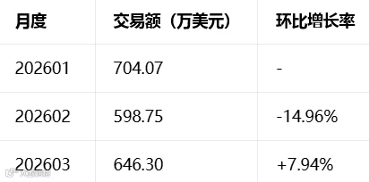 数据范围:2026 年 1 月 - 3 月;金额单位:美元;数量单位:公吨;同比基准:2025 年 1-3 月;环比基准:上月数据