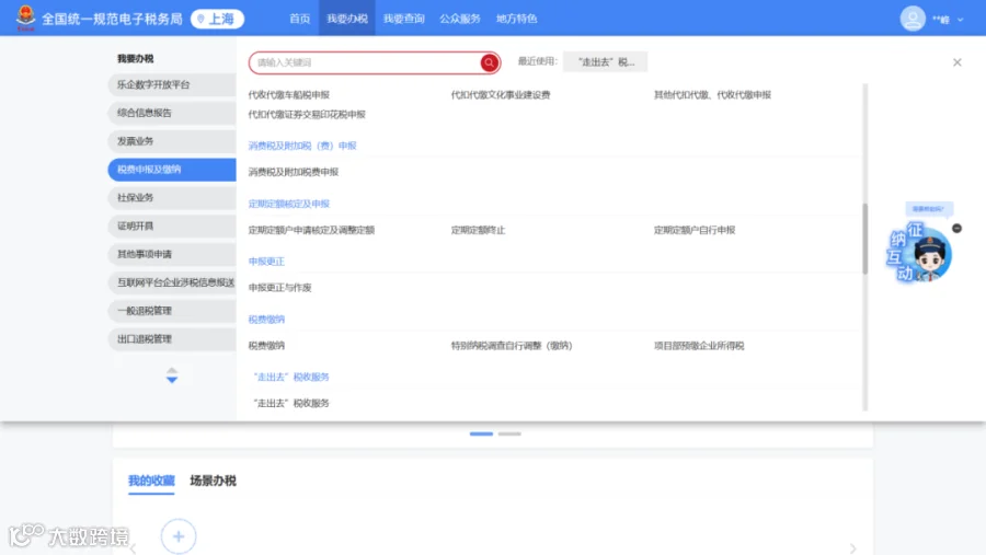 1. 以企业身份登录全国统一电子税务局,依次选择【我要办税】-【税费申报及缴纳】-【“走出去”税收服务】。