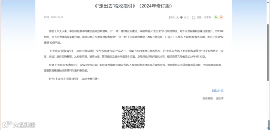 国家税务总局整合114个税收协定及相关政策,编制了《“走出去”税收指引》,从税收政策、税收协定、管理规定及服务举措四方面系统梳理120项涉税事项,为企业跨境经营提供实用指导。