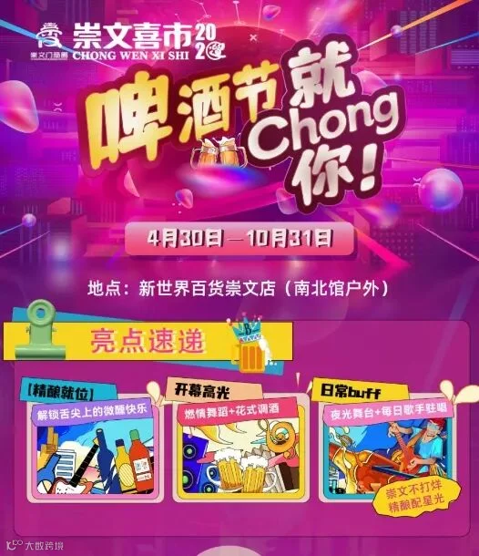 石景山首钢园举办潜江小龙虾节,引入12个品牌快闪摊位与十余种特色吃法;北京精酿啤酒节汇聚160余个品牌超1000款啤酒,搭配电音派对;通州万象汇举办碳水音浪节,推出河畔音乐会及歌手大赛等活动。