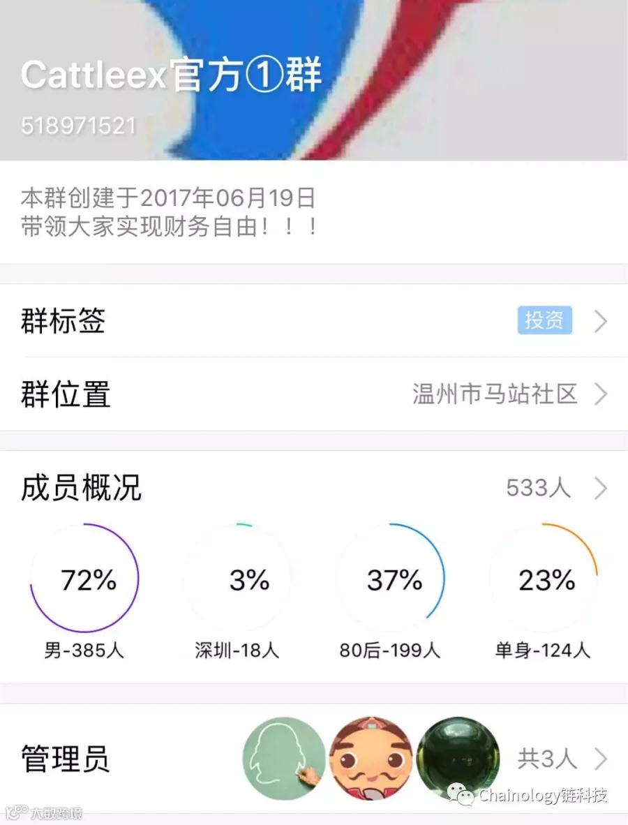随后链科技(ID:chainology)想进入官网放出的Q群和10万人的群去了解情况,结果也很意料之外。比如的Q群需要UID码方能申请,目前群人数只有533人,虽然CATTLEEK在官网表示成立于2018年1月,但这个Q群在2017年6月就已经成立。也不知道在这个群里,到底带领到了多少人获得了财富自由。