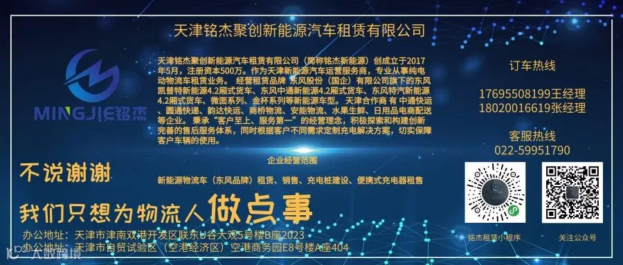 天津铭杰新能源汽车租赁隶属于天津融创供应链管理有限公司旗下子公司,是一家专注于新能源物流车集约化运营的服务配套商,致力于为各大快递物流及城配企业提供一站式的新能源物流车租赁及运营配套服务。