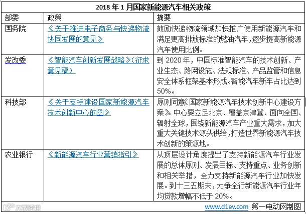 2018年1月,国务院、科技部、发改委等部门出台了新能源汽车相关政策。北京、深圳、济南、海南、漳州、平潭、唐山、南京、长沙、广东、如皋、长春等12省市出台新能源汽车相关政策。其中北京出台了国内首个自动驾驶车辆封闭测试场地技术要求和车辆测试能力评估内容与方法。广东和长沙出台了2018年新能源汽车补贴政策。平潭、长沙、唐山、南京和长春出台了充电基础设施政策。