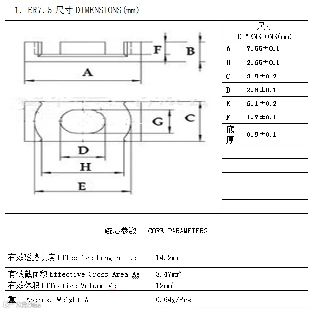 尺寸:ER系列型号是加大外尺寸,同时磁芯的内宽也相对应加大,对于线包比较满的产品就是很轻松组装,例如:ER28系列这款产品,大多数市场普遍为ER29,外尺寸做到29左右,这款产品我们磨具可以做到外尺寸30左右,对于线包特别满的就很轻松组装,相对于变压器成品功率也会加大。