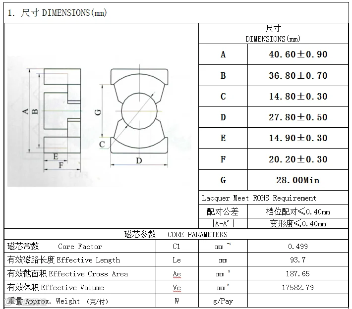 材质:这个系列的磁芯我们材质主要分为两种,通常叫法就是市场上的PC44 和PC95,这两种材质对比PC95的效果更好一点,功耗低一点,功耗越低代表着磁芯的材质越好!