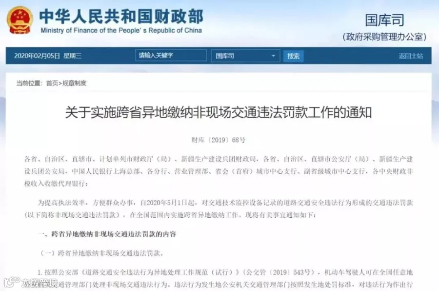 近日,据财政部网站消息,财政部、公安部、中国人民银行财等三部门联合下发《关于实施跨省异地缴纳非现场交通违法罚款工作的通知》。通知中明确,为提高执法效率,方便群众办事,自2020年5月1日起,对交通技术监控设备记录的道路交通安全违法行为形成的交通违法罚款(以下简称非现场交通违法罚款),在全国范围内实施跨省异地缴纳工作。