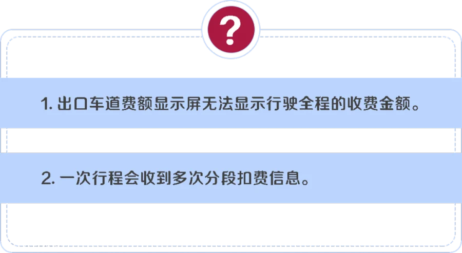 广东按照交通运输部统一部署,组织相关单位进一步优化了收费车道、ETC门架等系统功能,实现收费站出口车道及时显示当次通行的全程费用,做到“一次行程、一张账单、一次扣费、一次告知”。