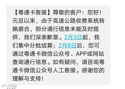 好在ETC扣费前还是提前有短信通知,短信内容大概为:全国高速公路联网收费系统正在加快转换磨合,1月元旦以来的账单扣费将会在2月份结算。所以大部分车主对1月份ETC迟迟不扣费的疑问,也终于得到了解答。